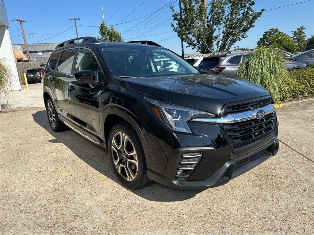 Black 2025 Subaru Ascent Limited AWD Lineartronic CVT 2.4L 4-Cylinder DOHC 16V 14 Speakers, 3rd row seats: bench, 4-Wheel Disc Brakes, ABS brakes, Air Conditioning, Alloy wheels, AM/FM radio: SiriusXM, Auto High-beam Headlights, Auto-dimming Rear-View mirror, Automatic temperature control, Brake assist, Bumpers: body-color, Compass, Delay-off headlights, Driver door bin, Driver vanity mirror, Dual front impact airbags, Dual front side impact airbags, Electronic Stability Control, Emergency communication system: STARLINK Safety and Security (Subscription Required), Exterior Parking Camera Rear, Four wheel independent suspension, Front anti-roll bar, Front Bucket Seats, Front Center Armrest, Front dual zone A/C, Front fog lights, Front reading lights, Fully automatic headlights, Garage door transmitter: HomeLink, harman/kardon® Speakers, Heated door mirrors, Heated Front Bucket Seats, Heated front seats, Heated rear seats, Heated steering wheel, Illuminated entry, Knee airbag, Leather Shift Knob, Leather steering wheel, Low tire pressure warning, Memory seat, Navigation System, Occupant sensing airbag, Outside temperature display, Overhead airbag, Overhead console, Panic alarm, Passenger door bin, Passenger vanity mirror, Perforated Leather-Trimmed Upholstery, Power door mirrors, Power driver seat, Power Liftgate, Power moonroof, Power passenger seat, Power steering, Power windows, Radio data system, Radio: Subaru STARLINK 11.6" Multimedia Nav System, Rear air conditioning, Rear anti-roll bar, Rear reading lights, Rear seat center armrest, Rear window defroster, Rear window wiper, Reclining 3rd row seat, Remote keyless entry, Security system, Speed control, Speed-sensing steering, Split folding rear seat, Spoiler, STARLINK/Apple CarPlay/Android Auto, Steering wheel mounted audio controls, Tachometer, Telescoping steering wheel, Tilt steering wheel, Traction control, Trip computer, Turn signal indicator mirrors, Variably intermittent wipers, Wheels: 20" x 7.5 J Dk Gray Alloy w/Machine Finish.