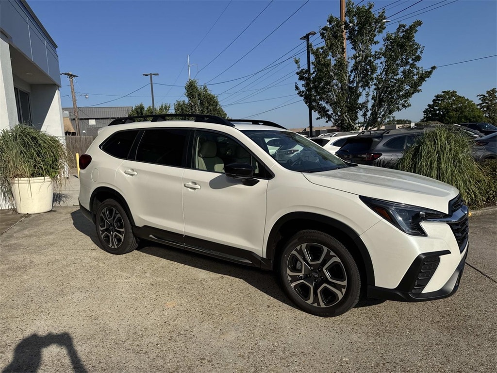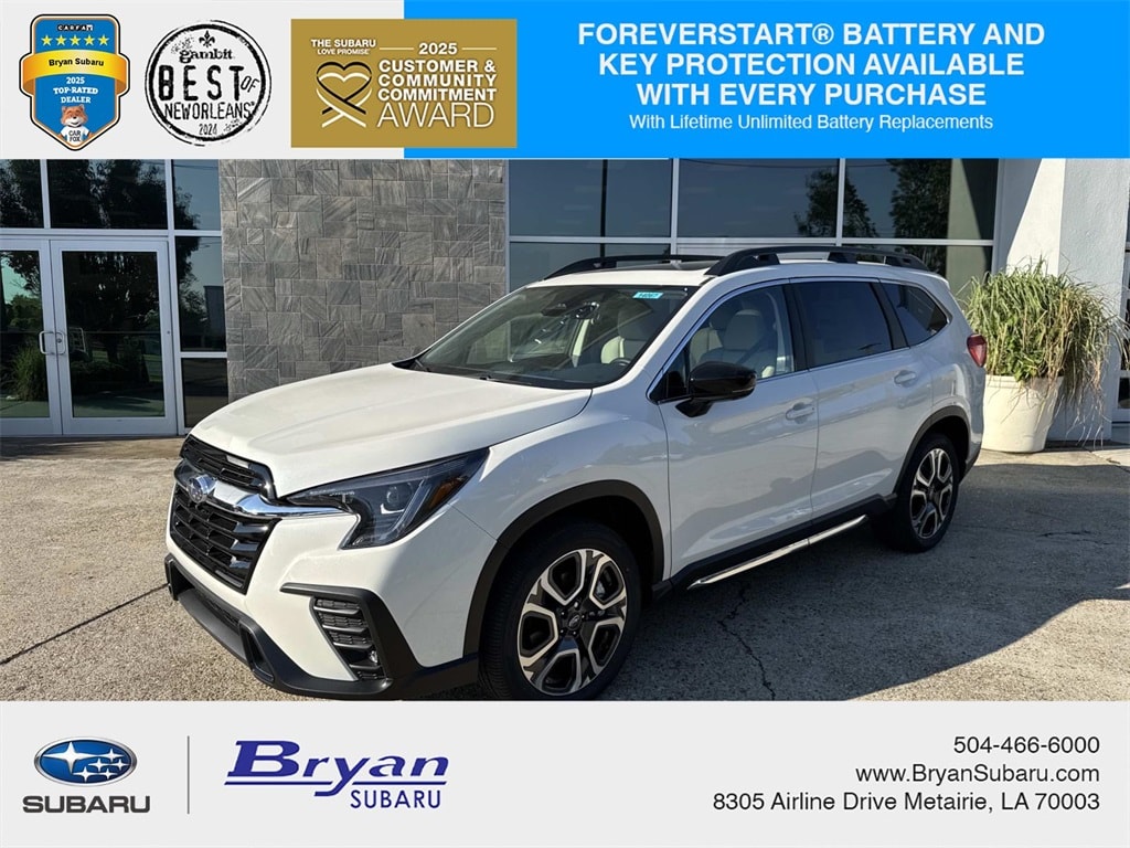 Crystal White Pearl 2025 Subaru Ascent Limited AWD Lineartronic CVT 2.4L 4-Cylinder DOHC 16V 14 Speakers, 3rd row seats: bench, 4-Wheel Disc Brakes, ABS brakes, Air Conditioning, Alloy wheels, AM/FM radio: SiriusXM, Auto High-beam Headlights, Auto-dimming Rear-View mirror, Automatic temperature control, Brake assist, Bumpers: body-color, Compass, Delay-off headlights, Driver door bin, Driver vanity mirror, Dual front impact airbags, Dual front side impact airbags, Electronic Stability Control, Emergency communication system: STARLINK Safety and Security (Subscription Required), Exterior Parking Camera Rear, Four wheel independent suspension, Front anti-roll bar, Front Bucket Seats, Front Center Armrest, Front dual zone A/C, Front fog lights, Front reading lights, Fully automatic headlights, Garage door transmitter: HomeLink, harman/kardon® Speakers, Heated door mirrors, Heated Front Bucket Seats, Heated front seats, Heated rear seats, Heated steering wheel, Illuminated entry, Knee airbag, Leather Shift Knob, Leather steering wheel, Low tire pressure warning, Memory seat, Navigation System, Occupant sensing airbag, Outside temperature display, Overhead airbag, Overhead console, Panic alarm, Passenger door bin, Passenger vanity mirror, Perforated Leather-Trimmed Upholstery, Power door mirrors, Power driver seat, Power Liftgate, Power moonroof, Power passenger seat, Power steering, Power windows, Radio data system, Radio: Subaru STARLINK 11.6" Multimedia Nav System, Rear air conditioning, Rear anti-roll bar, Rear reading lights, Rear window defroster, Rear window wiper, Reclining 3rd row seat, Remote keyless entry, Security system, Speed control, Speed-sensing steering, Split folding rear seat, Spoiler, STARLINK/Apple CarPlay/Android Auto, Steering wheel mounted audio controls, Tachometer, Telescoping steering wheel, Tilt steering wheel, Traction control, Trip computer, Turn signal indicator mirrors, Variably intermittent wipers, Wheels: 20" x 7.5 J Dk Gray Alloy w/Machine Finish.