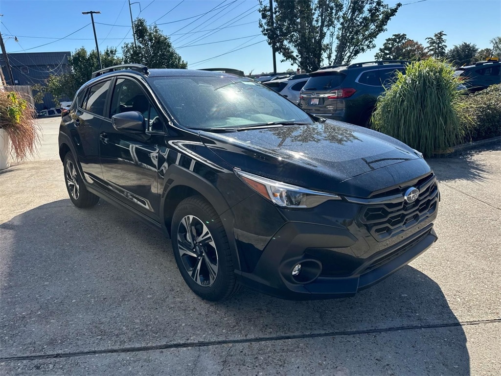 Black 2025 Subaru Crosstrek Premium AWD Lineartronic CVT 2.5L 4-Cylinder DOHC 16V 4-Wheel Disc Brakes, 6 Speakers, ABS brakes, Air Conditioning, Alloy wheels, AM/FM radio: SiriusXM, Anti-whiplash front head restraints, Auto High-beam Headlights, Automatic temperature control, Brake assist, Bumpers: body-color, Cloth Upholstery, Driver door bin, Driver vanity mirror, Dual front impact airbags, Dual front side impact airbags, Electronic Stability Control, Emergency communication system, Exterior Parking Camera Rear, Four wheel independent suspension, Front anti-roll bar, Front Bucket Seats, Front Center Armrest, Front dual zone A/C, Front fog lights, Front reading lights, Fully automatic headlights, Illuminated entry, Knee airbag, Low tire pressure warning, Occupant sensing airbag, Outside temperature display, Overhead airbag, Overhead console, Panic alarm, Passenger door bin, Passenger vanity mirror, Power door mirrors, Power steering, Power windows, Radio data system, Radio: Subaru 11.6" Multimedia Plus System, Rear anti-roll bar, Rear seat center armrest, Rear window defroster, Rear window wiper, Remote keyless entry, Security system, Speed control, Speed-sensing steering, Split folding rear seat, Spoiler, Steering wheel mounted audio controls, Tachometer, Telescoping steering wheel, Tilt steering wheel, Traction control, Trip computer, Turn signal indicator mirrors, Variably intermittent wipers, Wheels: 17" x 7.0" J Machine Finish Aluminum-Alloy.
