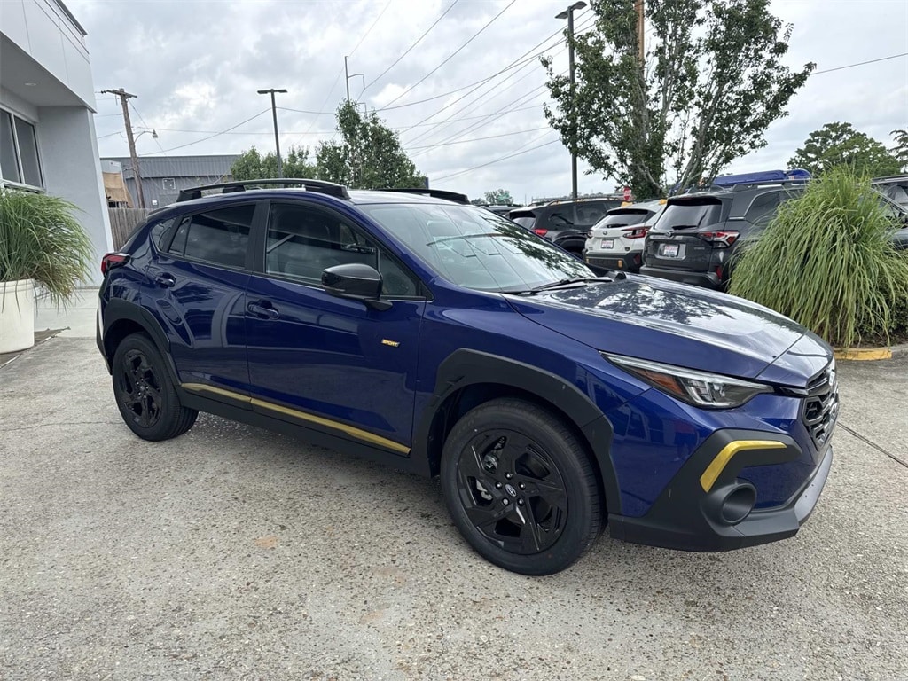Sapphire Blue Pearl 2025 Subaru Crosstrek Sport AWD Lineartronic CVT 2.5L 4-Cylinder DOHC 16V 4-Wheel Disc Brakes, 6 Speakers, ABS brakes, Air Conditioning, Alloy wheels, AM/FM radio: SiriusXM, Anti-whiplash front head restraints, Auto High-beam Headlights, Automatic temperature control, Brake assist, Bumpers: body-color, Driver door bin, Driver vanity mirror, Dual front impact airbags, Dual front side impact airbags, Electronic Stability Control, Emergency communication system: STARLINK Safety and Security (Subscription Required), Exterior Parking Camera Rear, Four wheel independent suspension, Front anti-roll bar, Front Bucket Seats, Front Center Armrest, Front dual zone A/C, Front fog lights, Front reading lights, Fully automatic headlights, Heated door mirrors, Heated Front Bucket Seats, Heated front seats, Illuminated entry, Knee airbag, Leather Shift Knob, Leather steering wheel, Low tire pressure warning, Occupant sensing airbag, Outside temperature display, Overhead airbag, Overhead console, Panic alarm, Passenger door bin, Passenger vanity mirror, Power door mirrors, Power steering, Power windows, Radio data system, Radio: Subaru STARLINK 11.6" Multimedia Plus Sys, Rear anti-roll bar, Rear seat center armrest, Rear window defroster, Rear window wiper, Remote keyless entry, Security system, Speed control, Speed-sensing steering, Split folding rear seat, Spoiler, Sport Cloth Upholstery, STARLINK/Apple CarPlay/Android Auto, Steering wheel mounted audio controls, Tachometer, Telescoping steering wheel, Tilt steering wheel, Traction control, Trip computer, Turn signal indicator mirrors, Variably intermittent wipers, Wheels: 18" x 7.0" J Dark Gray Aluminum-Alloy.