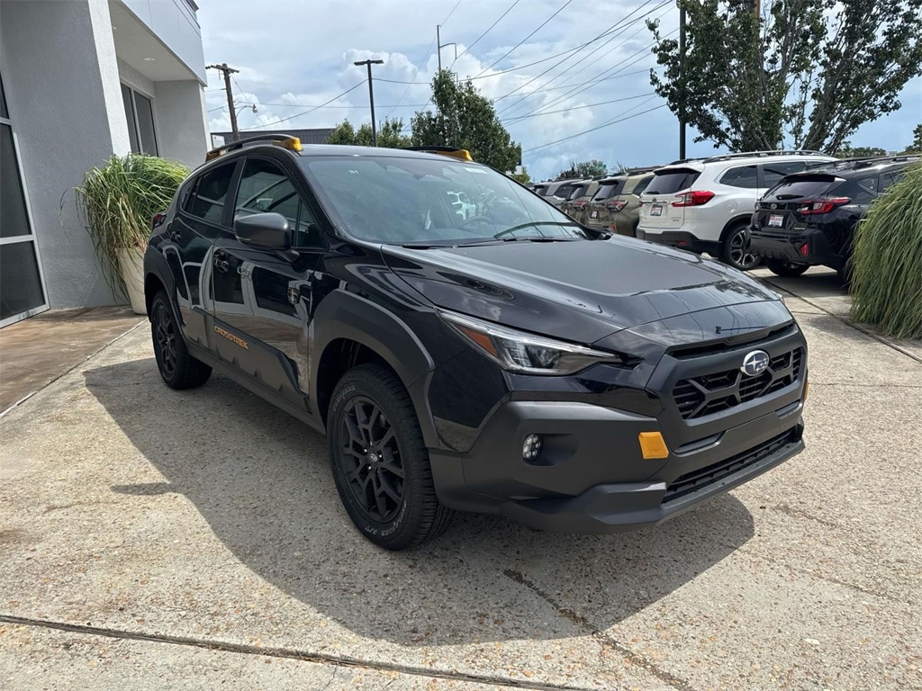 Black 2025 Subaru Crosstrek Wilderness AWD Lineartronic CVT 2.5L 4-Cylinder DOHC 16V 4-Wheel Disc Brakes, 6 Speakers, ABS brakes, Air Conditioning, Alloy wheels, AM/FM radio: SiriusXM, Anti-whiplash front head restraints, Auto High-beam Headlights, Automatic temperature control, Brake assist, Bumpers: body-color, Driver door bin, Driver vanity mirror, Dual front impact airbags, Dual front side impact airbags, Electronic Stability Control, Emergency communication system, Exterior Parking Camera Rear, Four wheel independent suspension, Front anti-roll bar, Front Bucket Seats, Front Center Armrest, Front dual zone A/C, Front fog lights, Front reading lights, Fully automatic headlights, Heated door mirrors, Heated Front Bucket Seats, Heated front seats, Illuminated entry, Knee airbag, Leather Shift Knob, Leather steering wheel, Low tire pressure warning, Occupant sensing airbag, Outside temperature display, Overhead airbag, Overhead console, Panic alarm, Passenger door bin, Passenger vanity mirror, Power door mirrors, Power steering, Power windows, Radio data system, Radio: Subaru 11.6" Multimedia Plus System, Rear anti-roll bar, Rear seat center armrest, Rear window defroster, Rear window wiper, Remote keyless entry, Security system, Speed control, Speed-sensing steering, Split folding rear seat, Spoiler, Steering wheel mounted audio controls, Tachometer, Telescoping steering wheel, Tilt steering wheel, Traction control, Trip computer, Turn signal indicator mirrors, Variably intermittent wipers, Wheels: 17" x 7.0" J Matte Black Aluminum-Alloy, Wilderness StarTex Upholstery.