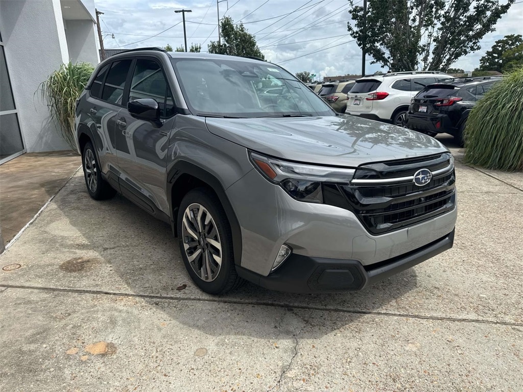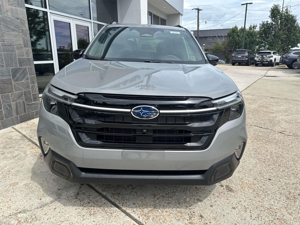 Gray 2025 Subaru Forester Hybrid Touring AWD Lineartronic CVT 2.5L 4-Cylinder DOHC 16V 11 Speakers, 4-Wheel Disc Brakes, ABS brakes, Air Conditioning, Alloy wheels, AM/FM radio: SiriusXM with 360L, Anti-whiplash front head restraints, Auto High-beam Headlights, Automatic temperature control, Brake assist, Bumpers: body-color, Compass, Driver door bin, Driver vanity mirror, Dual front impact airbags, Dual front side impact airbags, Electronic Stability Control, Emergency communication system: STARLINK Safety and Security (Subscription Required), Exterior Parking Camera Rear, Four wheel independent suspension, Front anti-roll bar, Front Bucket Seats, Front Center Armrest, Front dual zone A/C, Front fog lights, Front reading lights, Fully automatic headlights, harman/kardon® Speakers, Heated & Ventilated Front Bucket Seats, Heated door mirrors, Heated front seats, Heated rear seats, Heated steering wheel, HVAC memory, Illuminated entry, Knee airbag, Low tire pressure warning, Memory seat, Navigation system: TomTom Navigation w/what3words, Occupant sensing airbag, Outside temperature display, Overhead airbag, Overhead console, Panic alarm, Passenger door bin, Passenger vanity mirror, Perforated Leather-Trimmed Upholstery, Power door mirrors, Power driver seat, Power Liftgate, Power moonroof: Panoramic, Power passenger seat, Power steering, Power windows, Radio data system, Radio: Subaru STARLINK 11.6" Multimedia Nav System, Rear anti-roll bar, Rear seat center armrest, Rear window defroster, Rear window wiper, Remote keyless entry, Security system, Speed control, Speed-sensing steering, Split folding rear seat, Spoiler, Standard Model, STARLINK/Apple CarPlay/Android Auto, Steering wheel mounted audio controls, Tachometer, Telescoping steering wheel, Tilt steering wheel, Traction control, Trip computer, Turn signal indicator mirrors, Variably intermittent wipers, Ventilated front seats, Wheels: 19" x 7.5 J Dark Gray Aluminum-Alloy.
