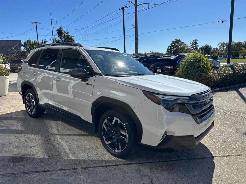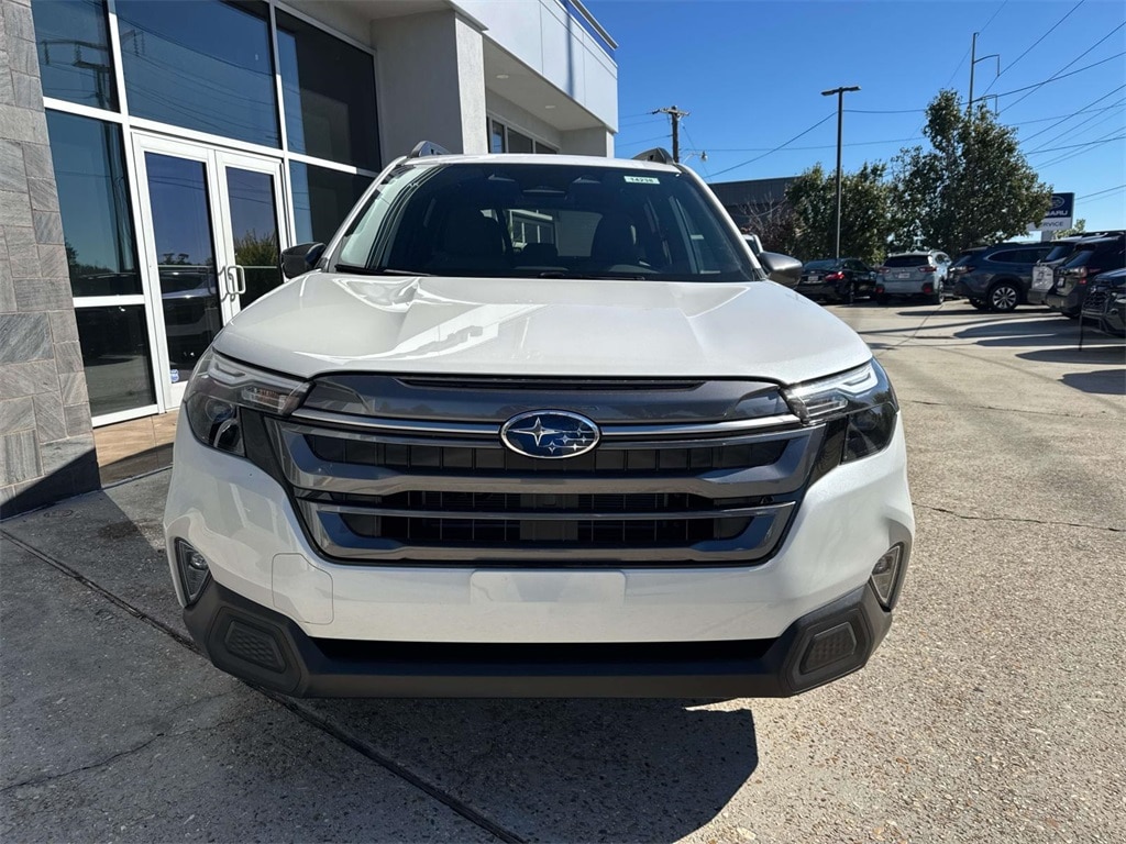 White 2025 Subaru Forester Hybrid Premium AWD Lineartronic CVT 2.5L 4-Cylinder DOHC 16V 4-Wheel Disc Brakes, 6 Speakers, ABS brakes, Air Conditioning, Alloy wheels, AM/FM radio: SiriusXM with 360L, Anti-whiplash front head restraints, Auto High-beam Headlights, Automatic temperature control, Brake assist, Bumpers: body-color, Compass, Driver door bin, Driver vanity mirror, Dual front impact airbags, Dual front side impact airbags, Electronic Stability Control, Emergency communication system: MySubaru Safety (3-year free trial), Exterior Parking Camera Rear, Four wheel independent suspension, Front anti-roll bar, Front Bucket Seats, Front Center Armrest, Front dual zone A/C, Front fog lights, Front reading lights, Fully automatic headlights, Heated door mirrors, Heated Front Bucket Seats, Heated front seats, Illuminated entry, Knee airbag, Low tire pressure warning, Navigation system: TomTom Navigation w/what3words, Occupant sensing airbag, Outside temperature display, Overhead airbag, Overhead console, Panic alarm, Passenger door bin, Passenger vanity mirror, Power door mirrors, Power driver seat, Power Liftgate, Power moonroof: Panoramic, Power steering, Power windows, Premium Cloth Upholstery, Radio data system, Radio: Subaru 11.6" Multimedia Navigation System, Rear anti-roll bar, Rear seat center armrest, Rear window defroster, Rear window wiper, Remote keyless entry, Security system, Speed control, Speed-sensing steering, Split folding rear seat, Spoiler, Standard Model, Steering wheel mounted audio controls, Tachometer, Telescoping steering wheel, Tilt steering wheel, Traction control, Trip computer, Variably intermittent wipers, Wheels: 18" x 7.0 J Dark Metallic Aluminum-Alloy.
