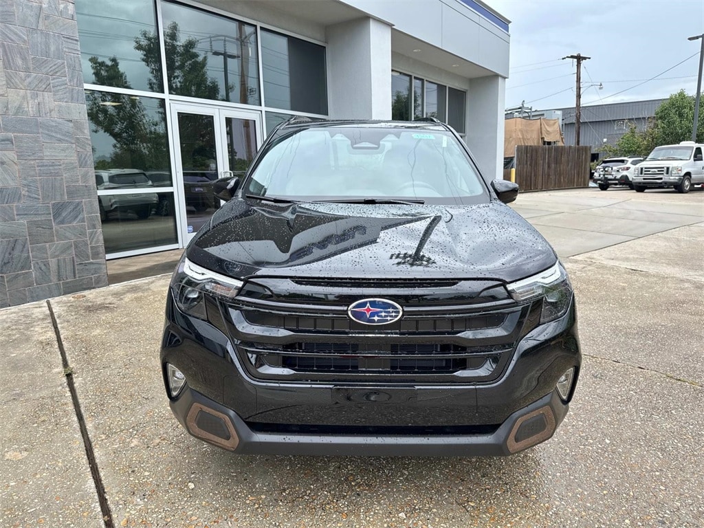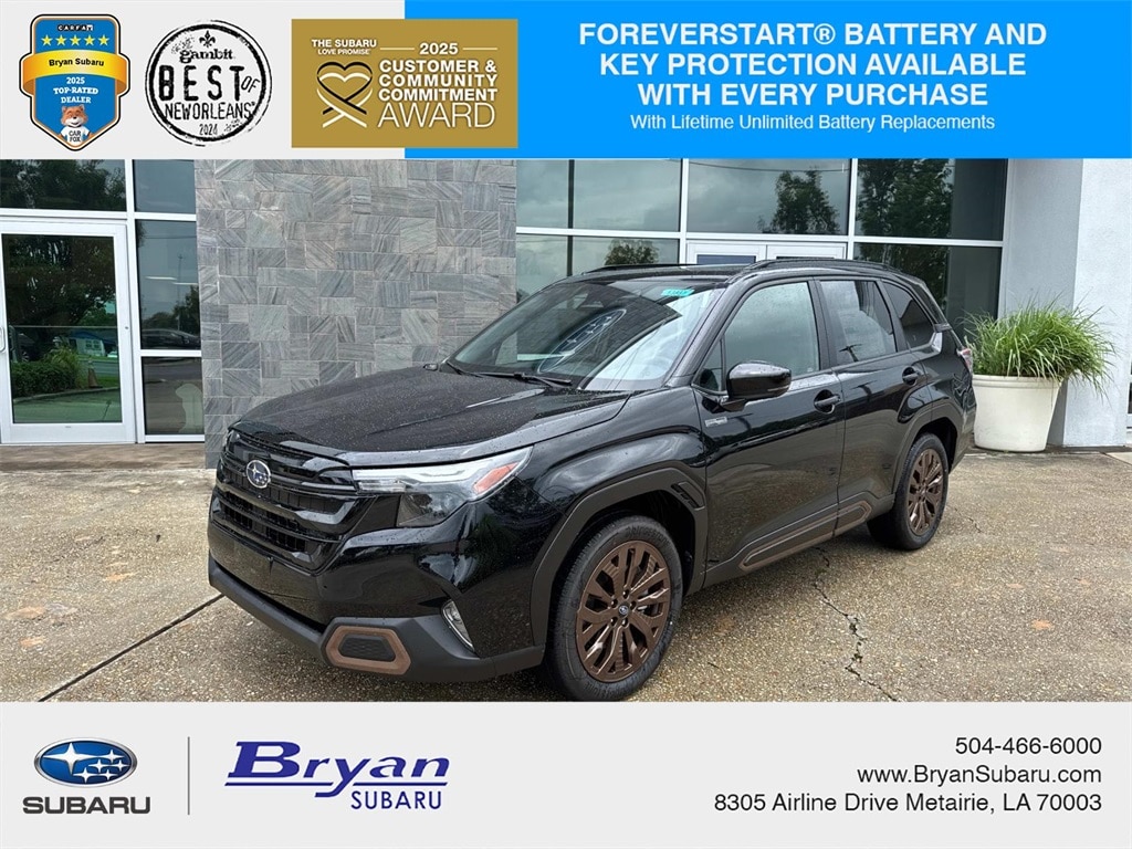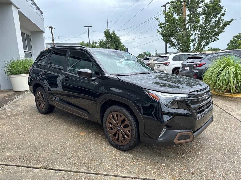 Crystal Black Silica 2025 Subaru Forester Hybrid Sport AWD Lineartronic CVT 2.5L 4-Cylinder DOHC 16V 11 Speakers, 4-Wheel Disc Brakes, ABS brakes, Air Conditioning, Alloy wheels, AM/FM radio: SiriusXM with 360L, Anti-whiplash front head restraints, Auto High-beam Headlights, Automatic temperature control, Brake assist, Bumpers: body-color, Compass, Driver door bin, Driver vanity mirror, Dual front impact airbags, Dual front side impact airbags, Electronic Stability Control, Emergency communication system: STARLINK Safety and Security (Subscription Required), Exterior Parking Camera Rear, Four wheel independent suspension, Front anti-roll bar, Front Bucket Seats, Front Center Armrest, Front dual zone A/C, Front fog lights, Front reading lights, Fully automatic headlights, harman/kardon® Speakers, Heated door mirrors, Heated Front Bucket Seats, Heated front seats, Illuminated entry, Knee airbag, Low tire pressure warning, Navigation system: TomTom Navigation w/what3words, Occupant sensing airbag, Outside temperature display, Overhead airbag, Overhead console, Panic alarm, Passenger door bin, Passenger vanity mirror, Power door mirrors, Power driver seat, Power Liftgate, Power moonroof: Panoramic, Power steering, Power windows, Radio data system, Radio: Subaru STARLINK 11.6" Multimedia Nav System, Rear anti-roll bar, Rear seat center armrest, Rear window defroster, Rear window wiper, Remote keyless entry, Security system, Speed control, Speed-sensing steering, Split folding rear seat, Spoiler, Sport StarTex Upholstery, Standard Model, STARLINK/Apple CarPlay/Android Auto, Steering wheel mounted audio controls, Tachometer, Telescoping steering wheel, Tilt steering wheel, Traction control, Trip computer, Turn signal indicator mirrors, Variably intermittent wipers, Wheels: 19" x 7.5 J Bronze Finish Aluminum-Alloy.