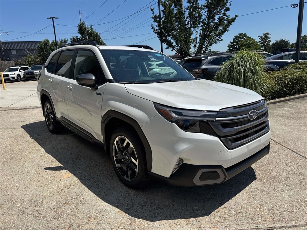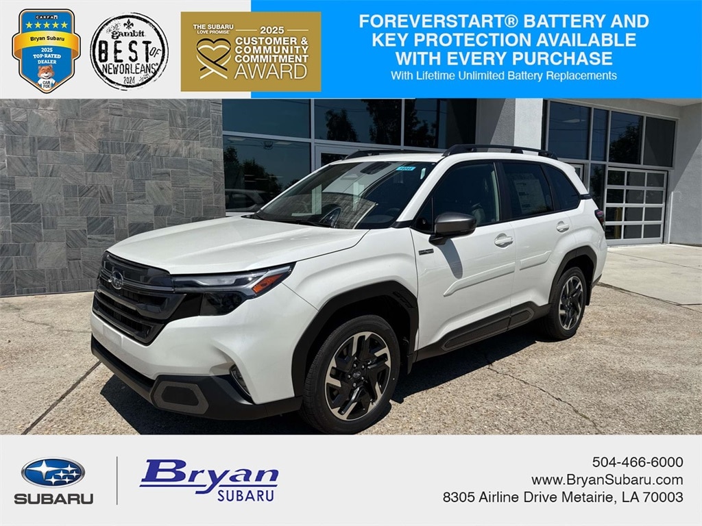 Whc 2025 Subaru Forester Hybrid Limited AWD Lineartronic CVT 2.5L 4-Cylinder DOHC 16V 11 Speakers, 4-Wheel Disc Brakes, ABS brakes, Air Conditioning, All-Weather Floor Liners, Alloy wheels, AM/FM radio: SiriusXM with 360L, Anti-whiplash front head restraints, Auto High-beam Headlights, Auto-Dimming Exterior Mirror w/Approach Light, Auto-Dimming Mirror w/Compass & HomeLink, Automatic temperature control, Body Side Molding - Crystal White Pearl, Brake assist, Bumpers: body-color, Cargo Tray, Center Console Tray, Compass, Driver door bin, Driver vanity mirror, Dual front impact airbags, Dual front side impact airbags, Electronic Stability Control, Emergency communication system: STARLINK Safety and Security (Subscription Required), Exterior Parking Camera Rear, Footwell Illumination Kit, Four wheel independent suspension, Front anti-roll bar, Front Bucket Seats, Front Center Armrest, Front dual zone A/C, Front fog lights, Front reading lights, Fully automatic headlights, harman/kardon® Speakers, Heated door mirrors, Heated Front Bucket Seats, Heated front seats, Illuminated entry, Knee airbag, LED Upgrade, Low tire pressure warning, Navigation system: TomTom Navigation w/what3words, Occupant sensing airbag, Outside temperature display, Overhead airbag, Overhead console, Panic alarm, Passenger door bin, Passenger vanity mirror, Power door mirrors, Power driver seat, Power Liftgate, Power moonroof: Panoramic, Power passenger seat, Power steering, Power windows, Radio data system, Radio: Subaru STARLINK 11.6" Multimedia Nav System, Rear anti-roll bar, Rear seat center armrest, Rear window defroster, Rear window wiper, Remote keyless entry, Security system, Side Sill Plates - Front, Speed control, Speed-sensing steering, Splash Guards, Split folding rear seat, Spoiler, Standard Model, STARLINK/Apple CarPlay/Android Auto, StarTex Upholstery, Steering wheel mounted audio controls, Sunshade - 2nd Row, Tachometer, Telescoping steering wheel, Tilt steering wheel, Traction control, Trip computer, Turn signal indicator mirrors, Variably intermittent wipers, Wheels: 18" x 7.0 J Dark Metallic Aluminum-Alloy.