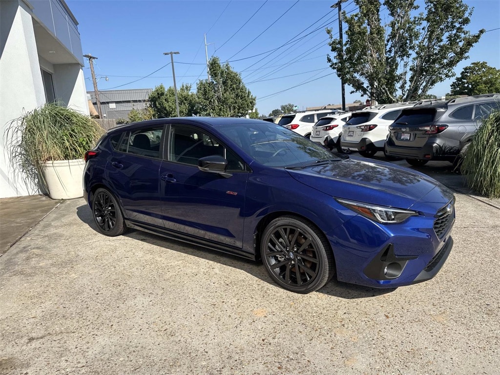 Sapphire Blue Pearl 2025 Subaru Impreza 2.5RS AWD CVT Lineartronic 2.5L I4 DOHC 16V 10-Way Power Driver's Seat, 4-Wheel Disc Brakes, 6 Speakers, ABS brakes, Air Conditioning, All-Weather Floor Liners, Alloy wheels, AM/FM radio: SiriusXM, Anti-whiplash front head restraints, Auto High-beam Headlights, Automatic temperature control, Brake assist, Bumpers: body-color, Cargo Tray, Driver door bin, Driver vanity mirror, Dual front impact airbags, Dual front side impact airbags, Electronic Stability Control, Emergency communication system: STARLINK Safety and Security (Subscription Required), Exterior Parking Camera Rear, Four wheel independent suspension, Front anti-roll bar, Front Bucket Seats, Front Center Armrest, Front dual zone A/C, Front fog lights, Front reading lights, Fully automatic headlights, H/K Audio & Power Moonroof & Power Driver Seat, harman/kardon Surround Sound Speaker System, Heated door mirrors, Heated Front Bucket Seats, Heated front seats, Illuminated entry, Knee airbag, Leather Shift Knob, LED Upgrade, Low tire pressure warning, Occupant sensing airbag, Outside temperature display, Overhead airbag, Overhead console, Panic alarm, Passenger door bin, Passenger vanity mirror, Power door mirrors, Power Moonroof, Power steering, Power windows, Radio data system, Radio: Subaru STARLINK 11.6" Multimedia Plus Sys, Rear anti-roll bar, Rear Gate Assist Handle, Rear seat center armrest, Rear window defroster, Rear window wiper, Remote keyless entry, RS Cloth Upholstery, Security system, Side Sill Plates, Speed control, Speed-sensing steering, Split folding rear seat, Spoiler, STARLINK/Apple CarPlay/Android Auto, Steering wheel mounted audio controls, Tachometer, Telescoping steering wheel, Tilt steering wheel, Traction control, Trip computer, Turn signal indicator mirrors, Variably intermittent wipers, Wheels: 18" x 7.0" J Dark Gray Aluminum-Alloy.