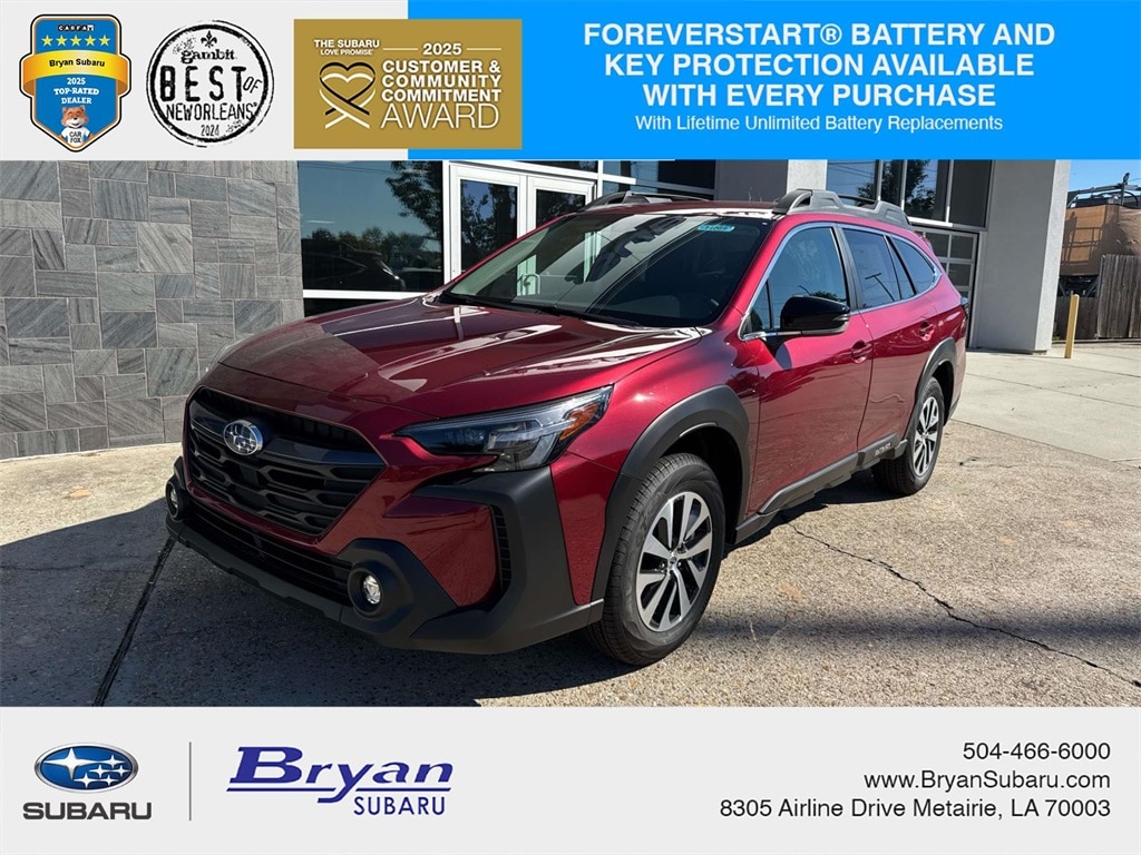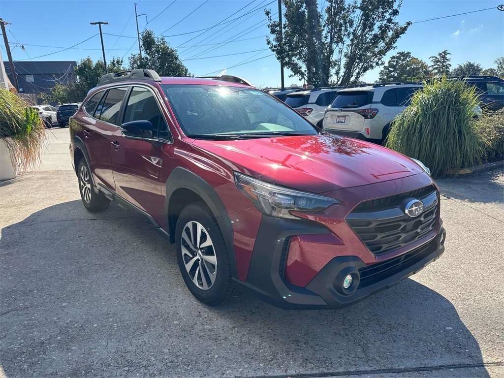 Red 2025 Subaru Outback Premium AWD CVT Lineartronic 2.5L 4-Cylinder DOHC 16V 4-Wheel Disc Brakes, 6 Speakers, ABS brakes, Air Conditioning, Alloy wheels, AM/FM radio: SiriusXM with 360L, Auto High-beam Headlights, Automatic temperature control, Brake assist, Bumpers: body-color, Cloth Upholstery, Driver door bin, Driver vanity mirror, Dual front impact airbags, Dual front side impact airbags, Electronic Stability Control, Emergency communication system: STARLINK Safety Plus (3-year free trial), Exterior Parking Camera Rear, Four wheel independent suspension, Front anti-roll bar, Front Bucket Seats, Front Center Armrest w/Storage, Front dual zone A/C, Front fog lights, Front reading lights, Fully automatic headlights, Heated door mirrors, Heated Front Bucket Seats, Heated front seats, Illuminated entry, Knee airbag, Leather Shift Knob, Leather steering wheel, Low tire pressure warning, Occupant sensing airbag, Outside temperature display, Overhead airbag, Overhead console, Panic alarm, Passenger door bin, Passenger vanity mirror, Power door mirrors, Power driver seat, Power steering, Power windows, Radio: Subaru STARLINK 11.6" Multimedia Plus Sys, Rear anti-roll bar, Rear seat center armrest, Rear window defroster, Rear window wiper, Remote keyless entry, Roof rack, Security system, Speed control, Speed-sensing steering, Split folding rear seat, Spoiler, Steering wheel mounted audio controls, Tachometer, Telescoping steering wheel, Tilt steering wheel, Traction control, Trip computer, Turn signal indicator mirrors, Variably intermittent wipers, Wheels: 17" x 7J Black Aluminum-Alloy.