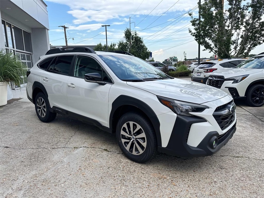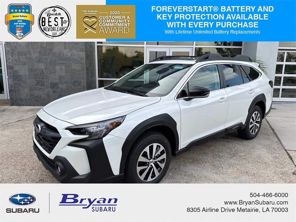 White 2025 Subaru Outback Premium AWD CVT Lineartronic 2.5L 4-Cylinder DOHC 16V 4-Wheel Disc Brakes, 6 Speakers, ABS brakes, Air Conditioning, Alloy wheels, AM/FM radio: SiriusXM with 360L, Auto High-beam Headlights, Automatic temperature control, Brake assist, Bumpers: body-color, Cloth Upholstery, Driver door bin, Driver vanity mirror, Dual front impact airbags, Dual front side impact airbags, Electronic Stability Control, Emergency communication system: STARLINK Safety Plus (3-year free trial), Exterior Parking Camera Rear, Four wheel independent suspension, Front anti-roll bar, Front Bucket Seats, Front Center Armrest w/Storage, Front dual zone A/C, Front fog lights, Front reading lights, Fully automatic headlights, Heated door mirrors, Heated Front Bucket Seats, Heated front seats, Illuminated entry, Knee airbag, Leather Shift Knob, Leather steering wheel, Low tire pressure warning, Occupant sensing airbag, Outside temperature display, Overhead airbag, Overhead console, Panic alarm, Passenger door bin, Passenger vanity mirror, Power door mirrors, Power driver seat, Power steering, Power windows, Radio: Subaru STARLINK 11.6" Multimedia Plus Sys, Rear anti-roll bar, Rear seat center armrest, Rear window defroster, Rear window wiper, Remote keyless entry, Roof rack, Security system, Speed control, Speed-sensing steering, Split folding rear seat, Spoiler, Steering wheel mounted audio controls, Tachometer, Telescoping steering wheel, Tilt steering wheel, Traction control, Trip computer, Turn signal indicator mirrors, Variably intermittent wipers, Wheels: 17" x 7J Black Aluminum-Alloy.