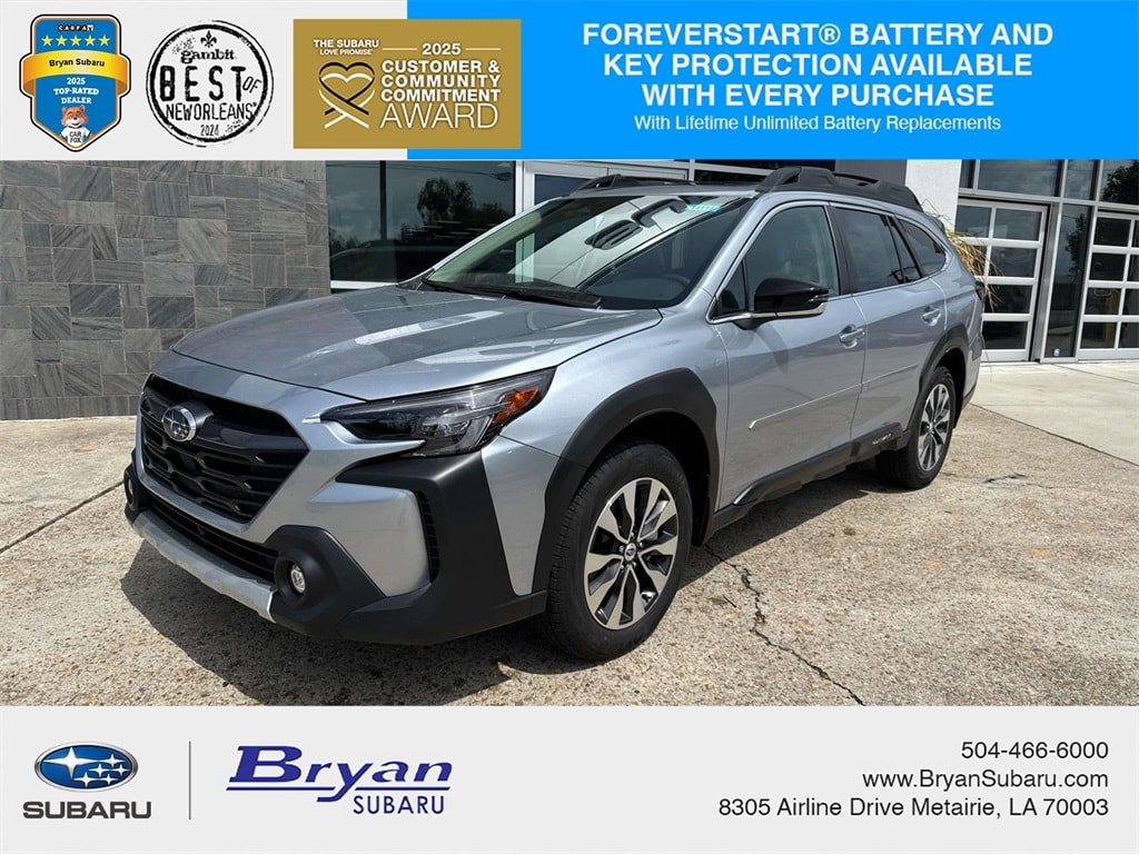 Ice Silver 2025 Subaru Outback Limited AWD CVT Lineartronic 2.5L 4-Cylinder DOHC 16V 12 Speakers, 4-Wheel Disc Brakes, ABS brakes, Air Conditioning, Alloy wheels, AM/FM radio: SiriusXM with 360L, Auto High-beam Headlights, Auto-dimming Rear-View mirror, Automatic temperature control, Brake assist, Bumpers: body-color, Compass, Driver door bin, Driver vanity mirror, Dual front impact airbags, Dual front side impact airbags, Electronic Stability Control, Emergency communication system: STARLINK Safety Plus (3-year free trial), Exterior Parking Camera Rear, Four wheel independent suspension, Front anti-roll bar, Front Bucket Seats, Front Center Armrest w/Storage, Front dual zone A/C, Front fog lights, Front reading lights, Fully automatic headlights, Garage door transmitter: HomeLink, harman/kardon® Speakers, Heated door mirrors, Heated Front Bucket Seats, Heated front seats, Heated rear seats, Heated steering wheel, HVAC memory, Illuminated entry, Knee airbag, Leather Shift Knob, Leather steering wheel, Low tire pressure warning, Memory seat, Navigation system: TomTom Navigation w/what3words, Occupant sensing airbag, Outside temperature display, Overhead airbag, Overhead console, Panic alarm, Passenger door bin, Passenger vanity mirror, Perforated Leather-Trimmed Upholstery, Power door mirrors, Power driver seat, Power Liftgate, Power moonroof, Power passenger seat, Power steering, Power windows, Radio: Subaru STARLINK 11.6" Multimedia Nav System, Rear anti-roll bar, Rear seat center armrest, Rear window defroster, Rear window wiper, Remote keyless entry, Roof rack, Security system, Speed control, Speed-sensing steering, Split folding rear seat, Spoiler, Steering wheel mounted audio controls, Tachometer, Telescoping steering wheel, Tilt steering wheel, Traction control, Trip computer, Turn signal indicator mirrors, Variably intermittent wipers, Wheels: 18" x 7J Black Aluminum-Alloy.