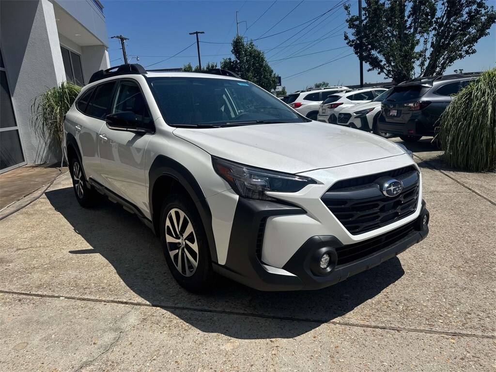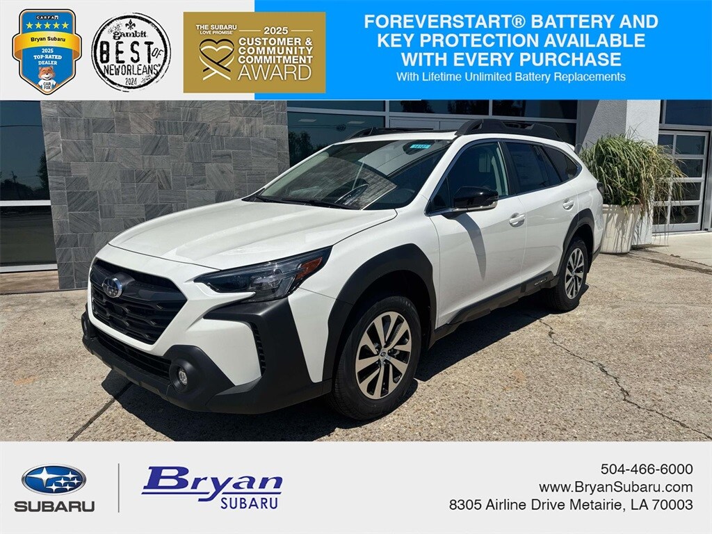 White 2025 Subaru Outback Premium AWD CVT Lineartronic 2.5L 4-Cylinder DOHC 16V 4-Wheel Disc Brakes, 6 Speakers, ABS brakes, Air Conditioning, Alloy wheels, AM/FM radio: SiriusXM with 360L, Auto High-beam Headlights, Automatic temperature control, Brake assist, Bumpers: body-color, Cloth Upholstery, Driver door bin, Driver vanity mirror, Dual front impact airbags, Dual front side impact airbags, Electronic Stability Control, Emergency communication system: STARLINK Safety Plus (3-year free trial), Exterior Parking Camera Rear, Four wheel independent suspension, Front anti-roll bar, Front Bucket Seats, Front Center Armrest w/Storage, Front dual zone A/C, Front fog lights, Front reading lights, Fully automatic headlights, Heated door mirrors, Heated Front Bucket Seats, Heated front seats, Illuminated entry, Knee airbag, Leather Shift Knob, Leather steering wheel, Low tire pressure warning, Occupant sensing airbag, Outside temperature display, Overhead airbag, Overhead console, Panic alarm, Passenger door bin, Passenger vanity mirror, Power door mirrors, Power driver seat, Power steering, Power windows, Radio: Subaru STARLINK 11.6" Multimedia Plus Sys, Rear anti-roll bar, Rear seat center armrest, Rear window defroster, Rear window wiper, Remote keyless entry, Roof rack, Security system, Speed control, Speed-sensing steering, Split folding rear seat, Spoiler, Steering wheel mounted audio controls, Tachometer, Telescoping steering wheel, Tilt steering wheel, Traction control, Trip computer, Turn signal indicator mirrors, Variably intermittent wipers, Wheels: 17" x 7J Black Aluminum-Alloy.