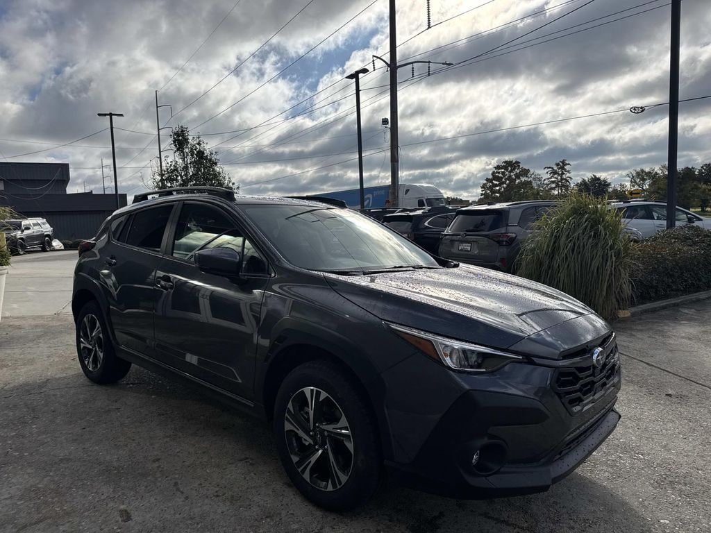 Gray 2026 Subaru Crosstrek Premium AWD Lineartronic CVT 2.5L 4-Cylinder DOHC 16V 4-Wheel Disc Brakes, 6 Speakers, ABS brakes, Air Conditioning, Alloy wheels, AM/FM radio: SiriusXM, Anti-whiplash front head restraints, Auto High-beam Headlights, Automatic temperature control, Brake assist, Bumpers: body-color, Cloth Upholstery, Driver door bin, Driver vanity mirror, Dual front impact airbags, Dual front side impact airbags, Electronic Stability Control, Emergency communication system: MySubaru Companion (5-years free), Exterior Parking Camera Rear, Four wheel independent suspension, Front anti-roll bar, Front Bucket Seats, Front Center Armrest, Front dual zone A/C, Front fog lights, Front reading lights, Fully automatic headlights, Illuminated entry, Knee airbag, Low tire pressure warning, Occupant sensing airbag, Outside temperature display, Overhead airbag, Overhead console, Panic alarm, Passenger door bin, Passenger vanity mirror, Power door mirrors, Power steering, Power windows, Radio data system, Radio: Subaru 11.6" Multimedia Plus System, Rear anti-roll bar, Rear seat center armrest, Rear side impact airbag, Rear window defroster, Rear window wiper, Remote keyless entry, Security system, Speed control, Speed-sensing steering, Split folding rear seat, Spoiler, Steering wheel mounted audio controls, Tachometer, Telescoping steering wheel, Tilt steering wheel, Traction control, Trip computer, Turn signal indicator mirrors, Variably intermittent wipers, Wheels: 17" x 7.0" J Machine Finish Aluminum-Alloy.