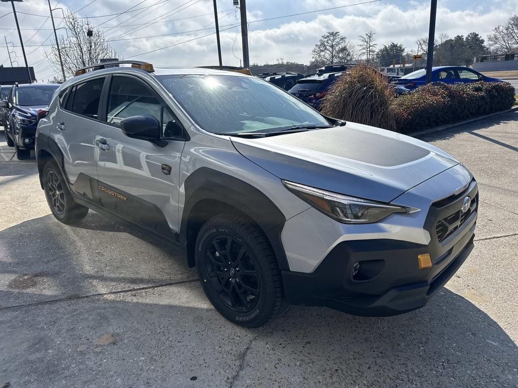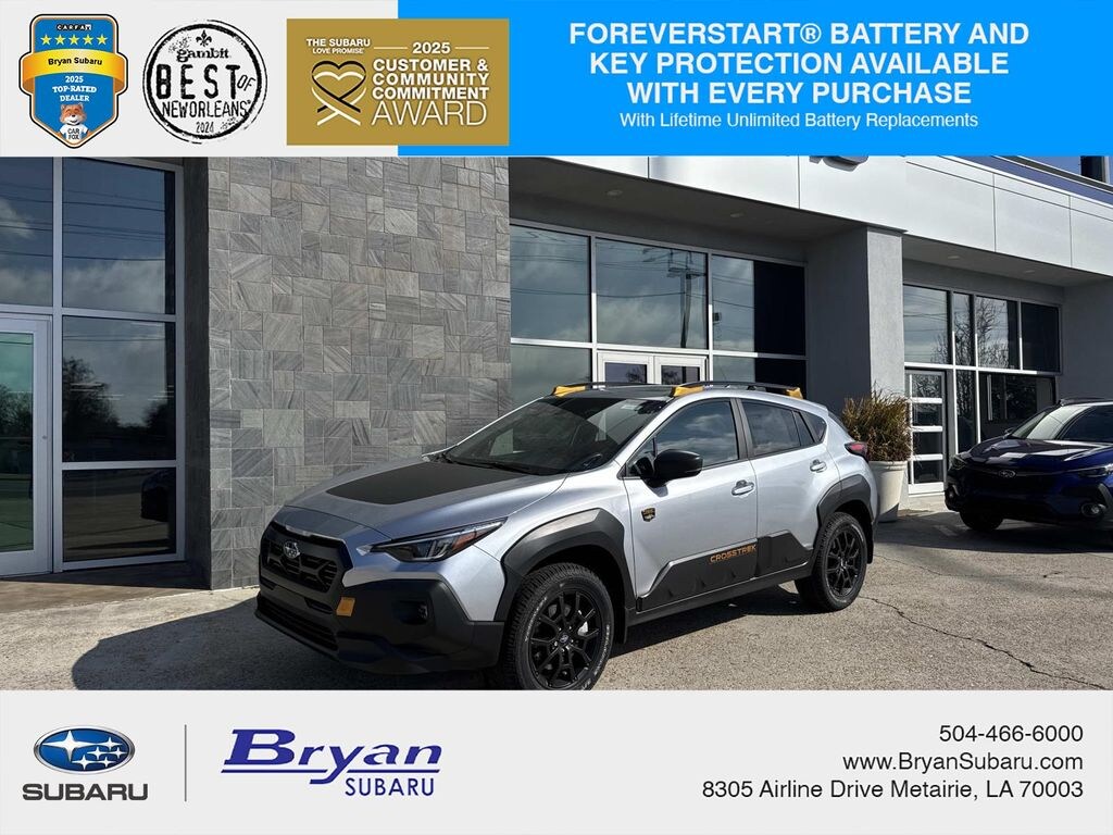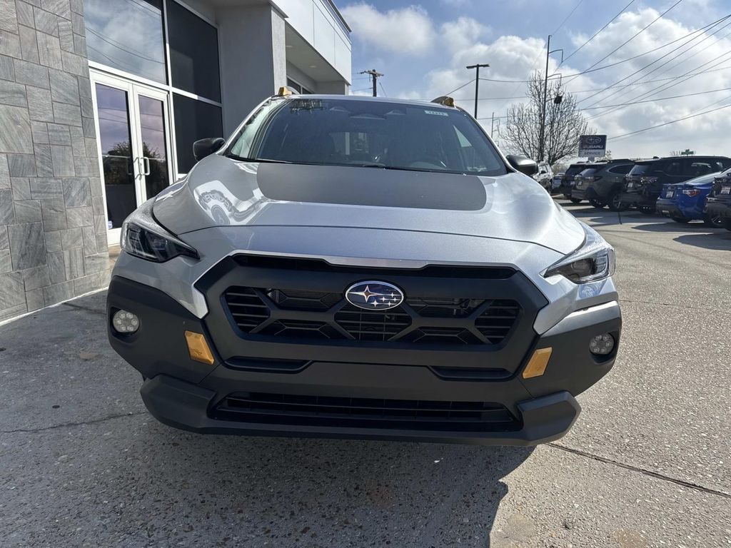 Ice Silver 2026 Subaru Crosstrek Wilderness AWD Lineartronic CVT 2.5L 4-Cylinder DOHC 16V 4-Wheel Disc Brakes, 6 Speakers, ABS brakes, Air Conditioning, Alloy wheels, AM/FM radio: SiriusXM, Anti-whiplash front head restraints, Auto High-beam Headlights, Automatic temperature control, Brake assist, Bumpers: body-color, Driver door bin, Driver vanity mirror, Dual front impact airbags, Dual front side impact airbags, Electronic Stability Control, Emergency communication system: MySubaru Companion (5-years free), Exterior Parking Camera Rear, Four wheel independent suspension, Front anti-roll bar, Front Bucket Seats, Front Center Armrest, Front dual zone A/C, Front fog lights, Front reading lights, Fully automatic headlights, Heated door mirrors, Heated Front Bucket Seats, Heated front seats, Heated steering wheel, Illuminated entry, Knee airbag, Leather Shift Knob, Leather steering wheel, Low tire pressure warning, Occupant sensing airbag, Outside temperature display, Overhead airbag, Overhead console, Panic alarm, Passenger door bin, Passenger vanity mirror, Power door mirrors, Power steering, Power windows, Radio data system, Radio: Subaru 11.6" Multimedia Plus System, Rear anti-roll bar, Rear seat center armrest, Rear side impact airbag, Rear window defroster, Rear window wiper, Remote keyless entry, Security system, Speed control, Speed-sensing steering, Split folding rear seat, Spoiler, Steering wheel mounted audio controls, Tachometer, Telescoping steering wheel, Tilt steering wheel, Traction control, Trip computer, Turn signal indicator mirrors, Variably intermittent wipers, Wheels: 17" x 7.0" J Matte Black Aluminum-Alloy, Wilderness StarTex Upholstery.