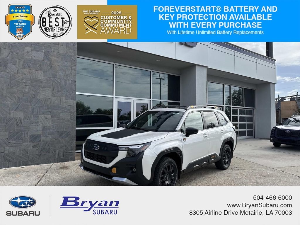 White 2026 Subaru Forester Wilderness AWD Lineartronic CVT 2.5L 4-Cylinder DOHC 16V 4-Wheel Disc Brakes, 6 Speakers, ABS brakes, Air Conditioning, Alloy wheels, AM/FM radio: SiriusXM with 360L, Anti-whiplash front head restraints, Auto High-beam Headlights, Automatic temperature control, Brake assist, Bumpers: body-color, Driver door bin, Driver vanity mirror, Dual front impact airbags, Dual front side impact airbags, Electronic Stability Control, Emergency communication system: MySubaru Companion (5-years free), Exterior Parking Camera Rear, Four wheel independent suspension, Front anti-roll bar, Front Bucket Seats, Front Center Armrest, Front dual zone A/C, Front fog lights, Front reading lights, Fully automatic headlights, Heated door mirrors, Heated Front Bucket Seats, Heated front seats, Illuminated entry, Knee airbag, Low tire pressure warning, Occupant sensing airbag, Outside temperature display, Overhead airbag, Overhead console, Panic alarm, Passenger door bin, Passenger vanity mirror, Power door mirrors, Power driver seat, Power moonroof: Panoramic, Power steering, Power windows, Radio data system, Radio: Subaru 11.6" Multimedia Plus System, Rain sensing wipers, Rear anti-roll bar, Rear seat center armrest, Rear window defroster, Rear window wiper, Remote keyless entry, Security system, Speed control, Speed-sensing steering, Split folding rear seat, Spoiler, Steering wheel mounted audio controls, Tachometer, Telescoping steering wheel, Textured StarTex Upholstery, Tilt steering wheel, Traction control, Trip computer, Turn signal indicator mirrors, Variably intermittent wipers, Wheels: 17" x 7.0 J Matte Black Finish Aluminum-Alloy.