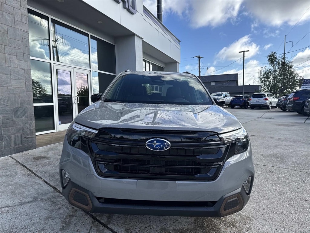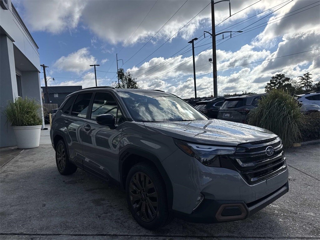 Gray 2026 Subaru Forester Sport AWD Lineartronic CVT 2.5L 4-Cylinder DOHC 16V 4-Wheel Disc Brakes, 6 Speakers, ABS brakes, Air Conditioning, Alloy wheels, AM/FM radio: SiriusXM with 360L, Anti-whiplash front head restraints, Auto High-beam Headlights, Automatic temperature control, Brake assist, Bumpers: body-color, Driver door bin, Driver vanity mirror, Dual front impact airbags, Dual front side impact airbags, Electronic Stability Control, Emergency communication system: MySubaru Companion (5-years free), Exterior Parking Camera Rear, Four wheel independent suspension, Front anti-roll bar, Front Bucket Seats, Front Center Armrest, Front dual zone A/C, Front fog lights, Front reading lights, Fully automatic headlights, Heated door mirrors, Heated Front Bucket Seats, Heated front seats, Illuminated entry, Knee airbag, Leather steering wheel, Low tire pressure warning, Occupant sensing airbag, Outside temperature display, Overhead airbag, Overhead console, Panic alarm, Passenger door bin, Passenger vanity mirror, Power door mirrors, Power driver seat, Power moonroof: Panoramic, Power steering, Power windows, Radio data system, Radio: Subaru 11.6" Multimedia Plus System, Rear anti-roll bar, Rear seat center armrest, Rear window defroster, Rear window wiper, Remote keyless entry, Security system, Speed control, Speed-sensing steering, Split folding rear seat, Spoiler, Sport StarTex Upholstery, Steering wheel mounted audio controls, Tachometer, Telescoping steering wheel, Tilt steering wheel, Traction control, Trip computer, Turn signal indicator mirrors, Variably intermittent wipers, Wheels: 19" x 7.5 J Bronze Finish Aluminum-Alloy.