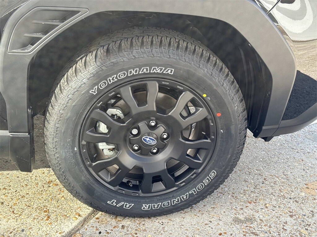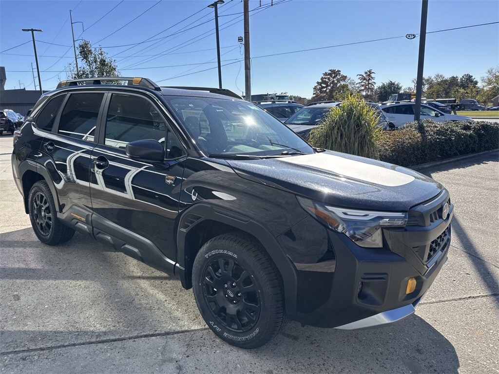 Black 2026 Subaru Forester Wilderness AWD Lineartronic CVT 2.5L 4-Cylinder DOHC 16V 4-Wheel Disc Brakes, 6 Speakers, ABS brakes, Air Conditioning, Alloy wheels, AM/FM radio: SiriusXM with 360L, Anti-whiplash front head restraints, Auto High-beam Headlights, Automatic temperature control, Brake assist, Bumpers: body-color, Driver door bin, Driver vanity mirror, Dual front impact airbags, Dual front side impact airbags, Electronic Stability Control, Emergency communication system: MySubaru Companion (5-years free), Exterior Parking Camera Rear, Four wheel independent suspension, Front anti-roll bar, Front Bucket Seats, Front Center Armrest, Front dual zone A/C, Front fog lights, Front reading lights, Fully automatic headlights, Heated door mirrors, Heated Front Bucket Seats, Heated front seats, Illuminated entry, Knee airbag, Low tire pressure warning, Occupant sensing airbag, Outside temperature display, Overhead airbag, Overhead console, Panic alarm, Passenger door bin, Passenger vanity mirror, Power door mirrors, Power driver seat, Power moonroof: Panoramic, Power steering, Power windows, Radio data system, Radio: Subaru 11.6" Multimedia Plus System, Rain sensing wipers, Rear anti-roll bar, Rear seat center armrest, Rear window defroster, Rear window wiper, Remote keyless entry, Security system, Speed control, Speed-sensing steering, Split folding rear seat, Spoiler, Steering wheel mounted audio controls, Tachometer, Telescoping steering wheel, Textured StarTex Upholstery, Tilt steering wheel, Traction control, Trip computer, Turn signal indicator mirrors, Variably intermittent wipers, Wheels: 17" x 7.0 J Matte Black Finish Aluminum-Alloy.