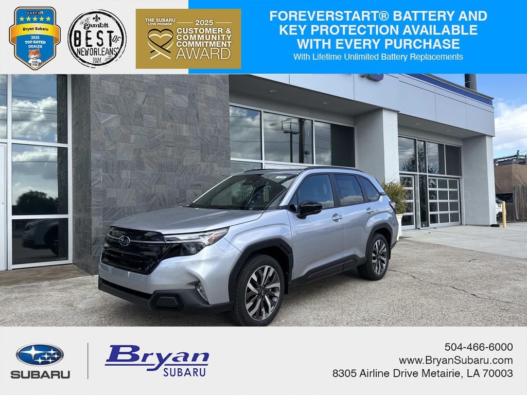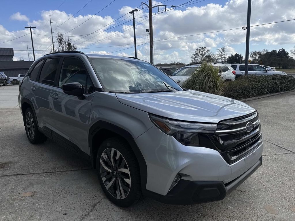 Ice Silver 2026 Subaru Forester Touring AWD Lineartronic CVT 2.5L 4-Cylinder DOHC 16V 11 Speakers, 4-Wheel Disc Brakes, ABS brakes, Air Conditioning, Alloy wheels, AM/FM radio: SiriusXM with 360L, Anti-whiplash front head restraints, Auto High-beam Headlights, Automatic temperature control, Brake assist, Bumpers: body-color, Driver door bin, Driver vanity mirror, Dual front impact airbags, Dual front side impact airbags, Electronic Stability Control, Emergency communication system: MySubaru Companion (5-years free), Exterior Parking Camera Rear, Four wheel independent suspension, Front anti-roll bar, Front Bucket Seats, Front Center Armrest, Front dual zone A/C, Front fog lights, Front reading lights, Fully automatic headlights, harman/kardon® Speakers, Heads-Up Display, Heated and Ventilated Front Bucket Seats, Heated door mirrors, Heated front seats, Heated rear seats, Heated steering wheel, HVAC memory, Illuminated entry, Knee airbag, Leather Shift Knob, Leather steering wheel, Low tire pressure warning, Memory seat, Navigation System, Occupant sensing airbag, Outside temperature display, Overhead airbag, Overhead console, Panic alarm, Passenger door bin, Passenger vanity mirror, Perforated Leather-Trimmed Upholstery, Power door mirrors, Power driver seat, Power Liftgate, Power moonroof: Panoramic, Power passenger seat, Power steering, Power windows, Radio data system, Radio: Subaru 11.6" Multimedia Navigation System, Rain sensing wipers, Rear anti-roll bar, Rear seat center armrest, Rear window defroster, Rear window wiper, Remote keyless entry, Security system, Speed control, Speed-sensing steering, Split folding rear seat, Spoiler, Steering wheel mounted audio controls, Tachometer, Telescoping steering wheel, Tilt steering wheel, Traction control, Trip computer, Turn signal indicator mirrors, Variably intermittent wipers, Ventilated front seats, Wheels: 19" x 7.5 J Dark Gray Aluminum-Alloy.