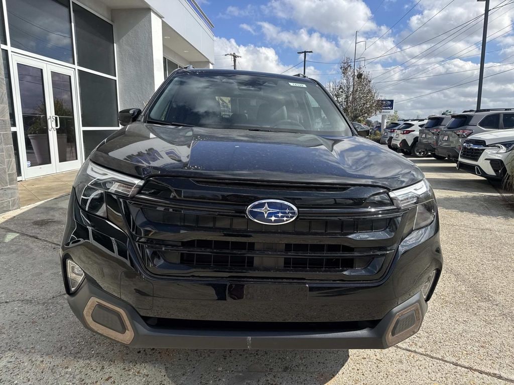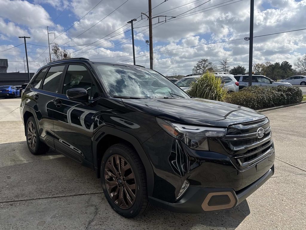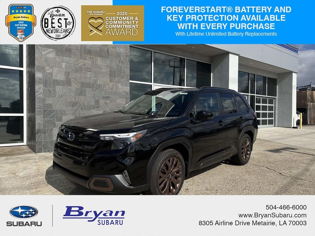 Black 2026 Subaru Forester Sport AWD Lineartronic CVT 2.5L 4-Cylinder DOHC 16V 4-Wheel Disc Brakes, 6 Speakers, ABS brakes, Air Conditioning, Alloy wheels, AM/FM radio: SiriusXM with 360L, Anti-whiplash front head restraints, Auto High-beam Headlights, Automatic temperature control, Brake assist, Bumpers: body-color, Driver door bin, Driver vanity mirror, Dual front impact airbags, Dual front side impact airbags, Electronic Stability Control, Emergency communication system: MySubaru Companion (5-years free), Exterior Parking Camera Rear, Four wheel independent suspension, Front anti-roll bar, Front Bucket Seats, Front Center Armrest, Front dual zone A/C, Front fog lights, Front reading lights, Fully automatic headlights, Heated door mirrors, Heated Front Bucket Seats, Heated front seats, Illuminated entry, Knee airbag, Leather steering wheel, Low tire pressure warning, Occupant sensing airbag, Outside temperature display, Overhead airbag, Overhead console, Panic alarm, Passenger door bin, Passenger vanity mirror, Power door mirrors, Power driver seat, Power moonroof: Panoramic, Power steering, Power windows, Radio data system, Radio: Subaru 11.6" Multimedia Plus System, Rear anti-roll bar, Rear seat center armrest, Rear window defroster, Rear window wiper, Remote keyless entry, Security system, Speed control, Speed-sensing steering, Split folding rear seat, Spoiler, Sport StarTex Upholstery, Steering wheel mounted audio controls, Tachometer, Telescoping steering wheel, Tilt steering wheel, Traction control, Trip computer, Turn signal indicator mirrors, Variably intermittent wipers, Wheels: 19" x 7.5 J Bronze Finish Aluminum-Alloy.