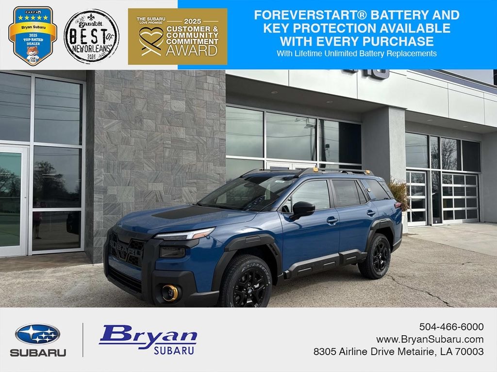 Blue 2026 Subaru Outback Wilderness AWD CVT Lineartronic 2.4L 4-Cylinder DOHC 16V 12 Speakers, 4-Wheel Disc Brakes, ABS brakes, Air Conditioning, Alloy wheels, AM/FM radio: SiriusXM with 360L, Anti-whiplash front head restraints, Auto High-beam Headlights, Automatic temperature control, Blind Spot Warning, Brake assist, Bumpers: body-color, Driver door bin, Driver vanity mirror, Dual front impact airbags, Dual front side impact airbags, Electronic Stability Control, Emergency communication system: MySubaru Companion (5-years free), Exterior Parking Camera Rear, Four wheel independent suspension, Front anti-roll bar, Front Bucket Seats, Front Center Armrest w/Storage, Front dual zone A/C, Front fog lights, Front reading lights, Fully automatic headlights, harman/kardon® Speakers, Heated door mirrors, Heated Front Bucket Seats, Heated front seats, Heated rear seats, Heated steering wheel, HVAC memory, Illuminated entry, Knee airbag, Leather Shift Knob, Leather steering wheel, Low tire pressure warning, Occupant sensing airbag, Outside temperature display, Overhead airbag, Overhead console, Panic alarm, Passenger door bin, Passenger vanity mirror, Power door mirrors, Power driver seat, Power Liftgate, Power steering, Power windows, Radio: Subaru 12.1" Multimedia System, Rain sensing wipers, Rear anti-roll bar, Rear seat center armrest, Rear window defroster, Rear window wiper, Remote keyless entry, Security system, Speed control, Speed-sensing steering, Split folding rear seat, Spoiler, StarTex-Trimmed Upholstery, Steering wheel mounted audio controls, Tachometer, Telescoping steering wheel, Tilt steering wheel, Traction control, Trip computer, Turn signal indicator mirrors, Variably intermittent wipers, Wheels: 17" x 7J Matte Black Finish Aluminum-Alloy.